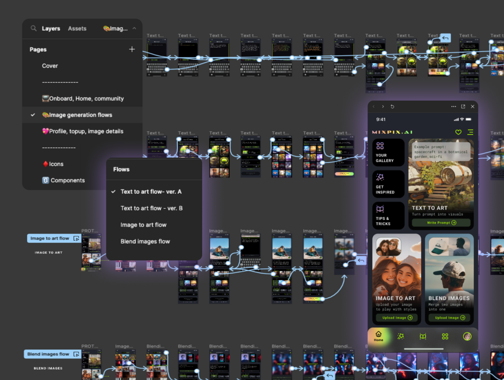 • Interactive AI Art Generation Flows: Explore 4 prototyped functionality flows that showcase the cutting-edge features of an AI art generator app, complete with thoughtful micro-interactions.